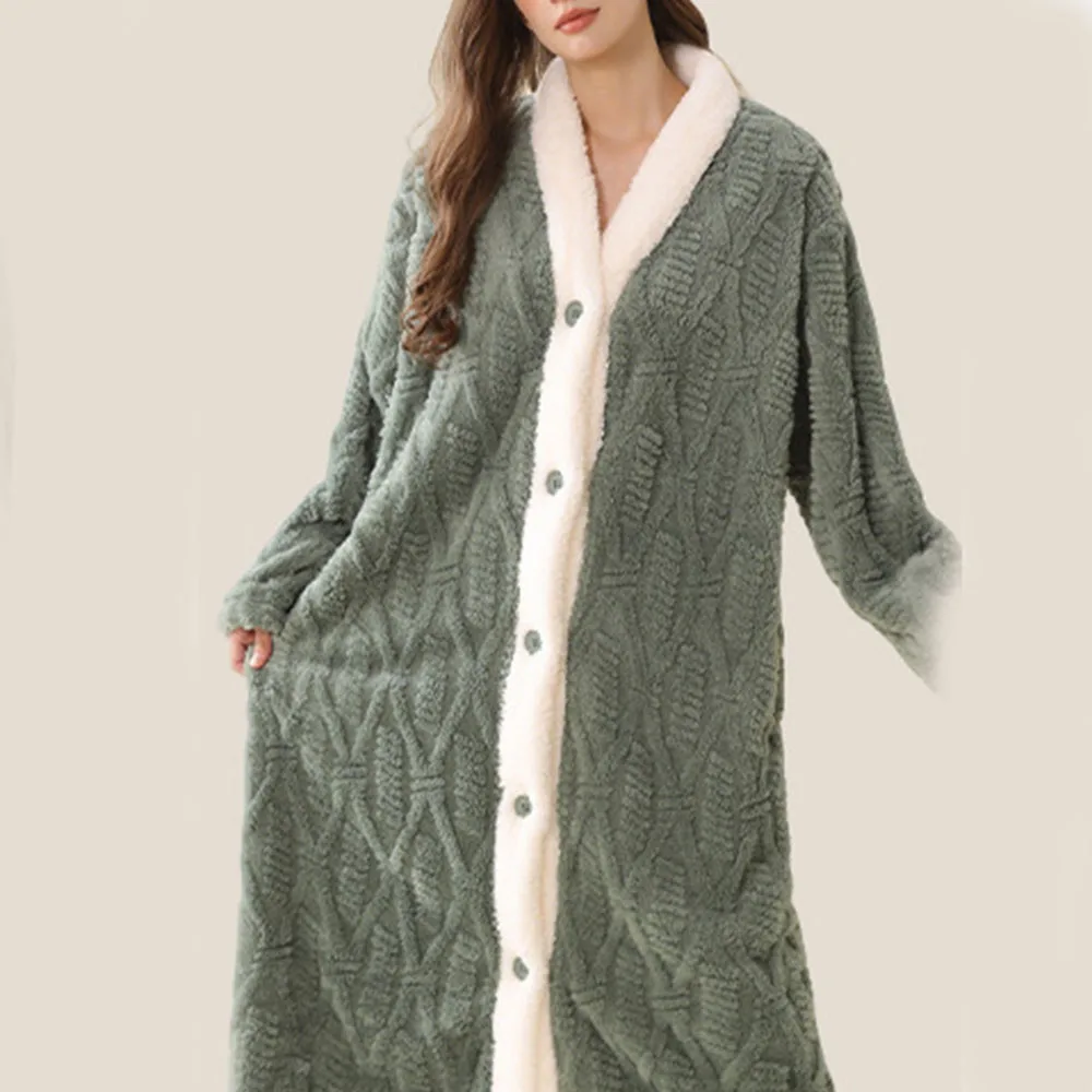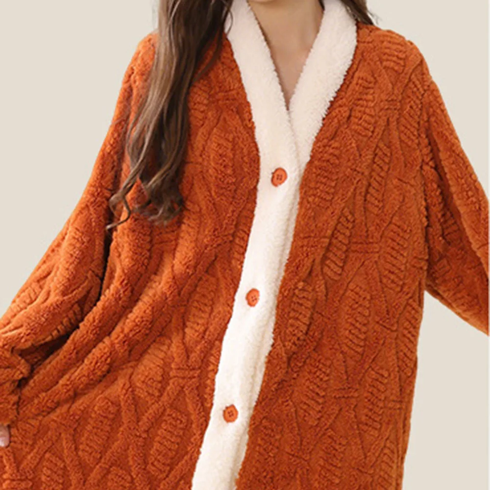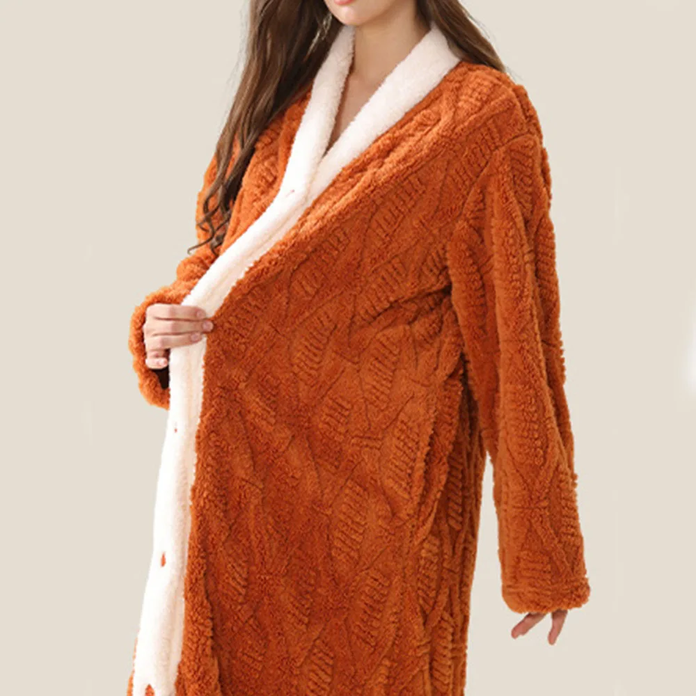 Stay warm and stylish in this soft cotton velvet robe. Designed with a V-neck, button front, and waist tie for a perfect fit, it’s ideal for cozy nights and relaxed mornings. Long-sleeved and mid calf in length for full comfort and warmth.