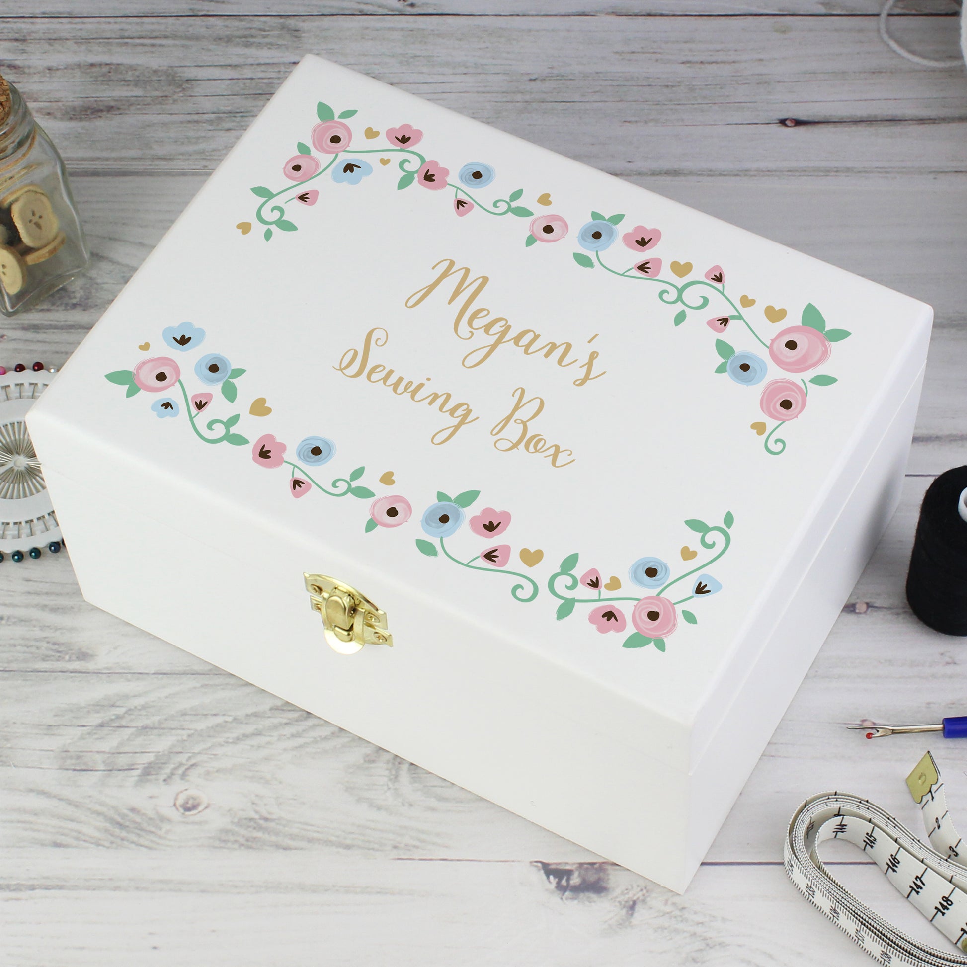 This gorgeous keepsake box is ideal for storing art supplies, souvenirs, trinkets, makeup and it's also ideal as a personalised sewing kit!