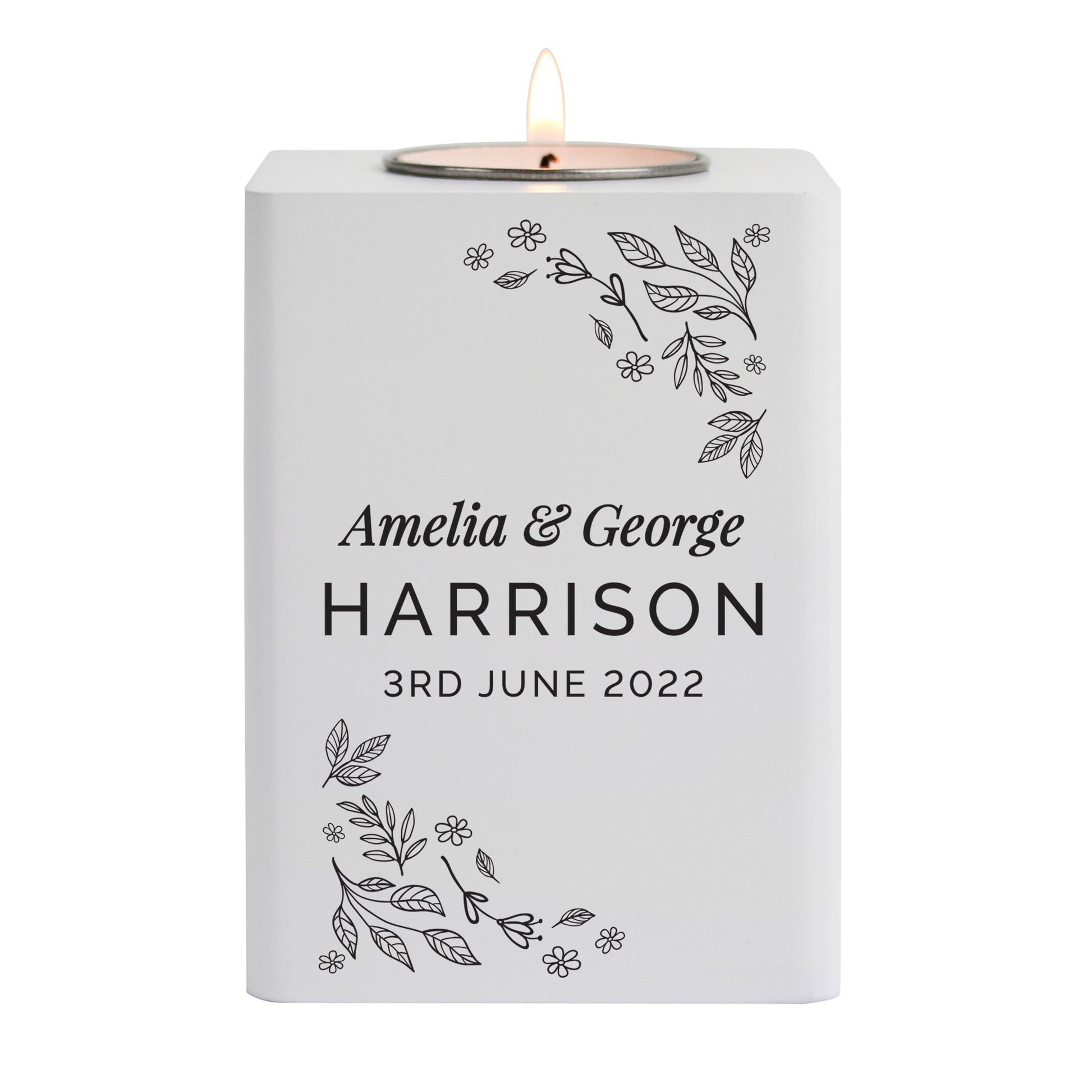 Personalised Floral Leaf White Wooden Tea Light Holder