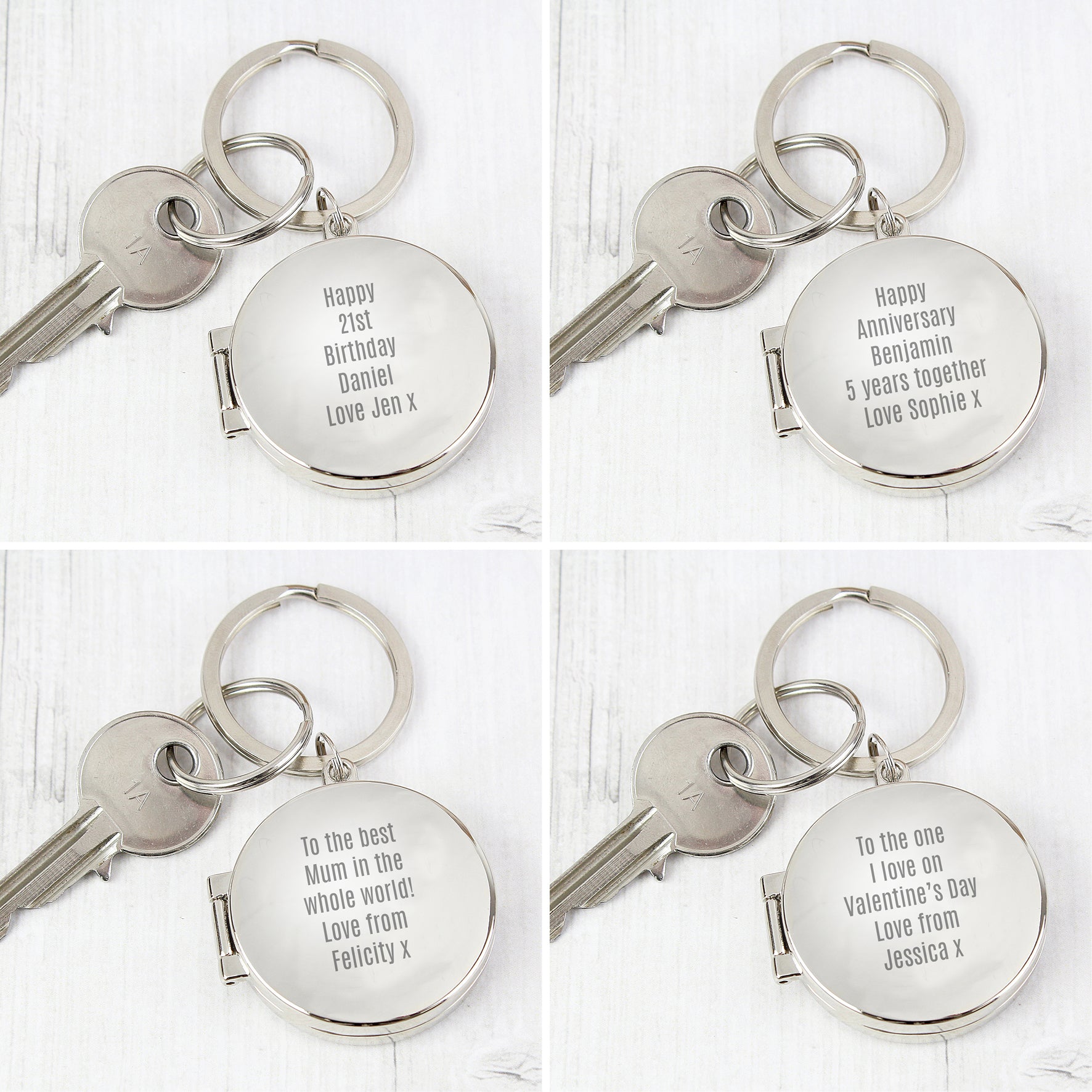 The keyring has a silver finish and can hold two images sized 3x3cm.
