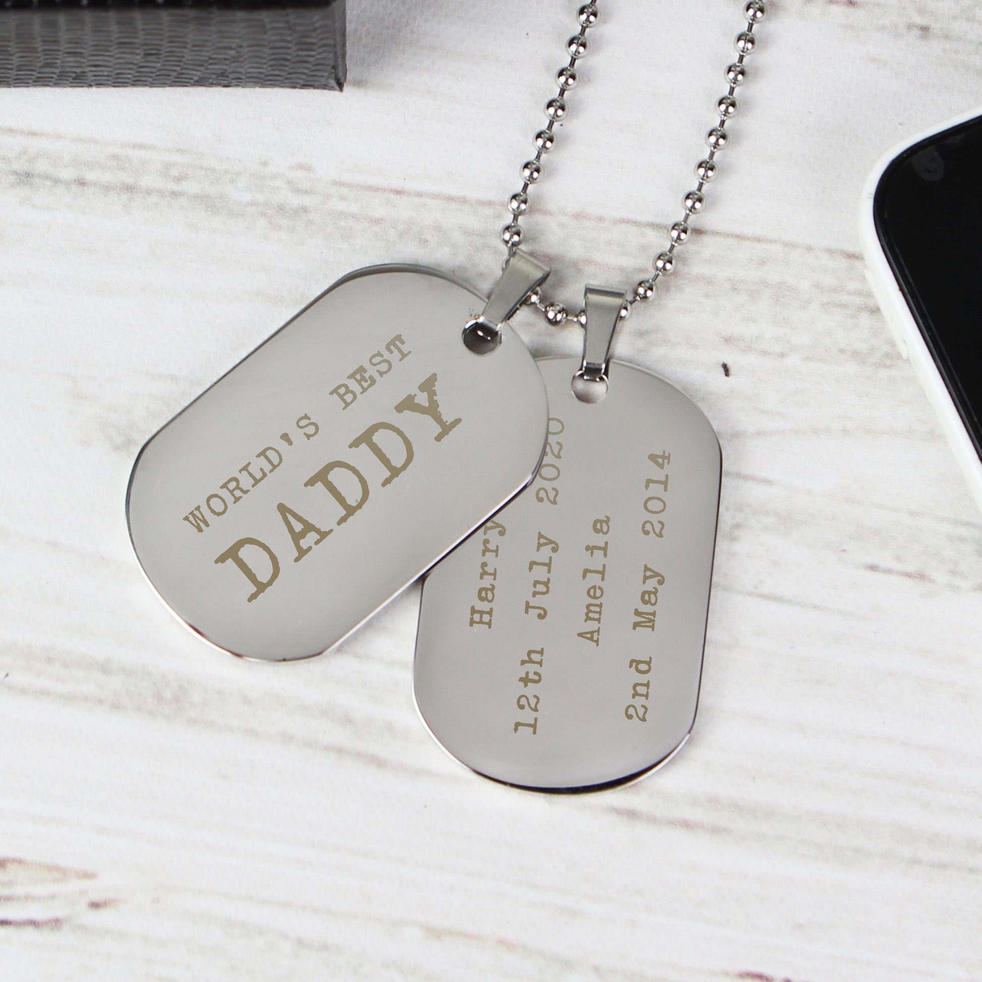 The first tag can be personalised with 2 Lines of text. The second dog tag can be personalised with up to 4 lines, 20 characters per line.