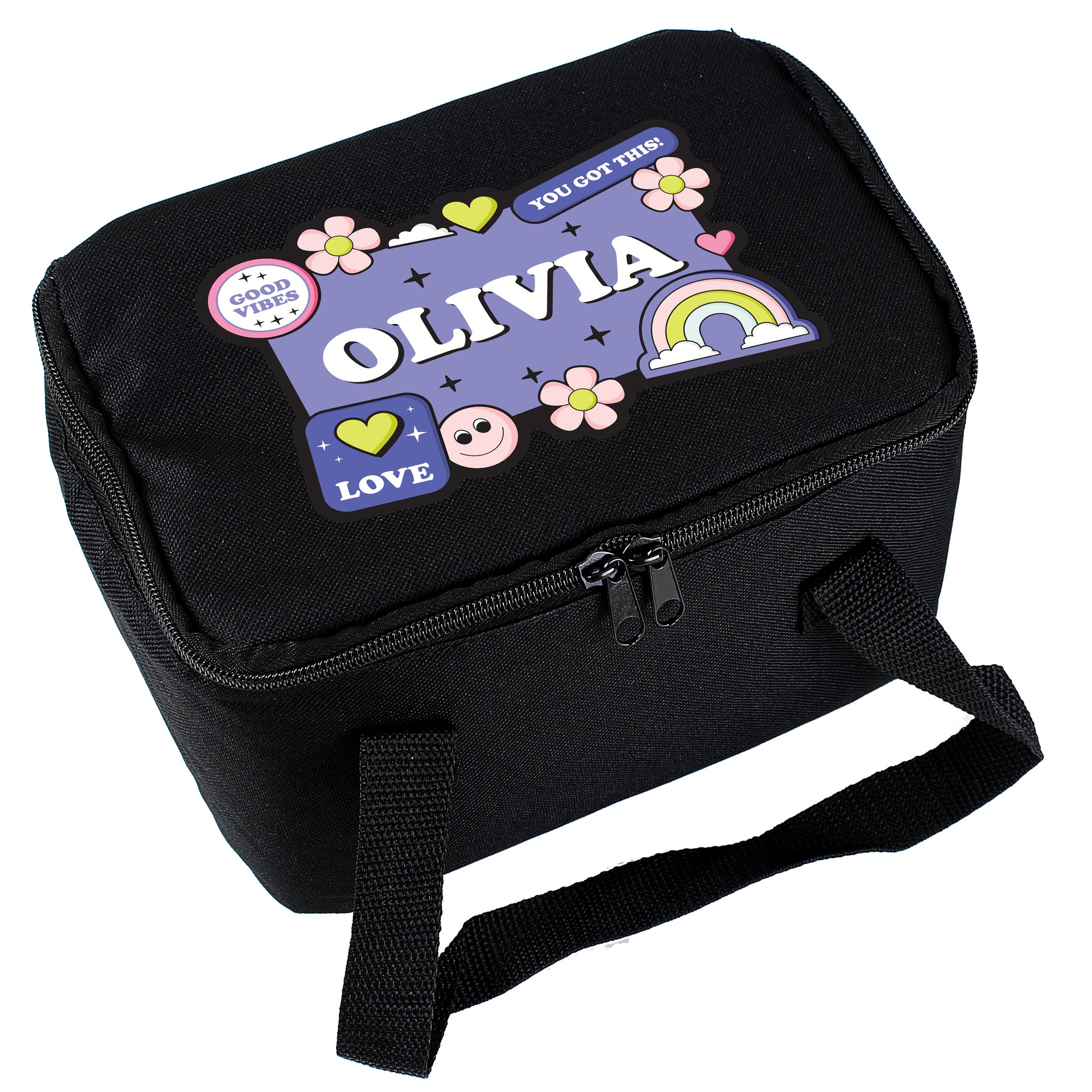 Personalised Good Vibes Black Lunch Bag