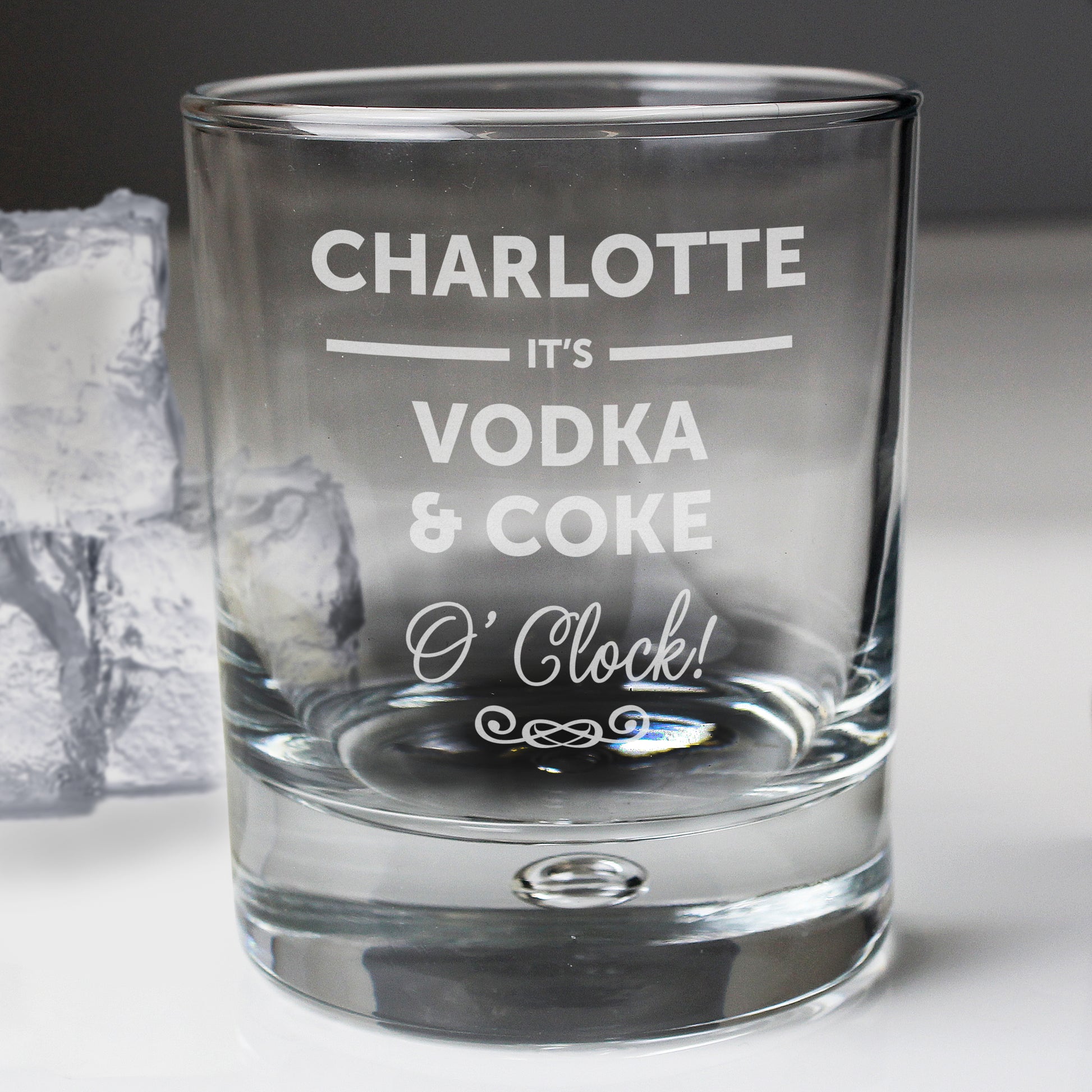 The glass can be personalised with a name up to 12 characters and a message over two lines of text, with up to 12 characters per line. Lines 2 and 3 can be a beverage of your choice i.e. Vodka & Coke.
