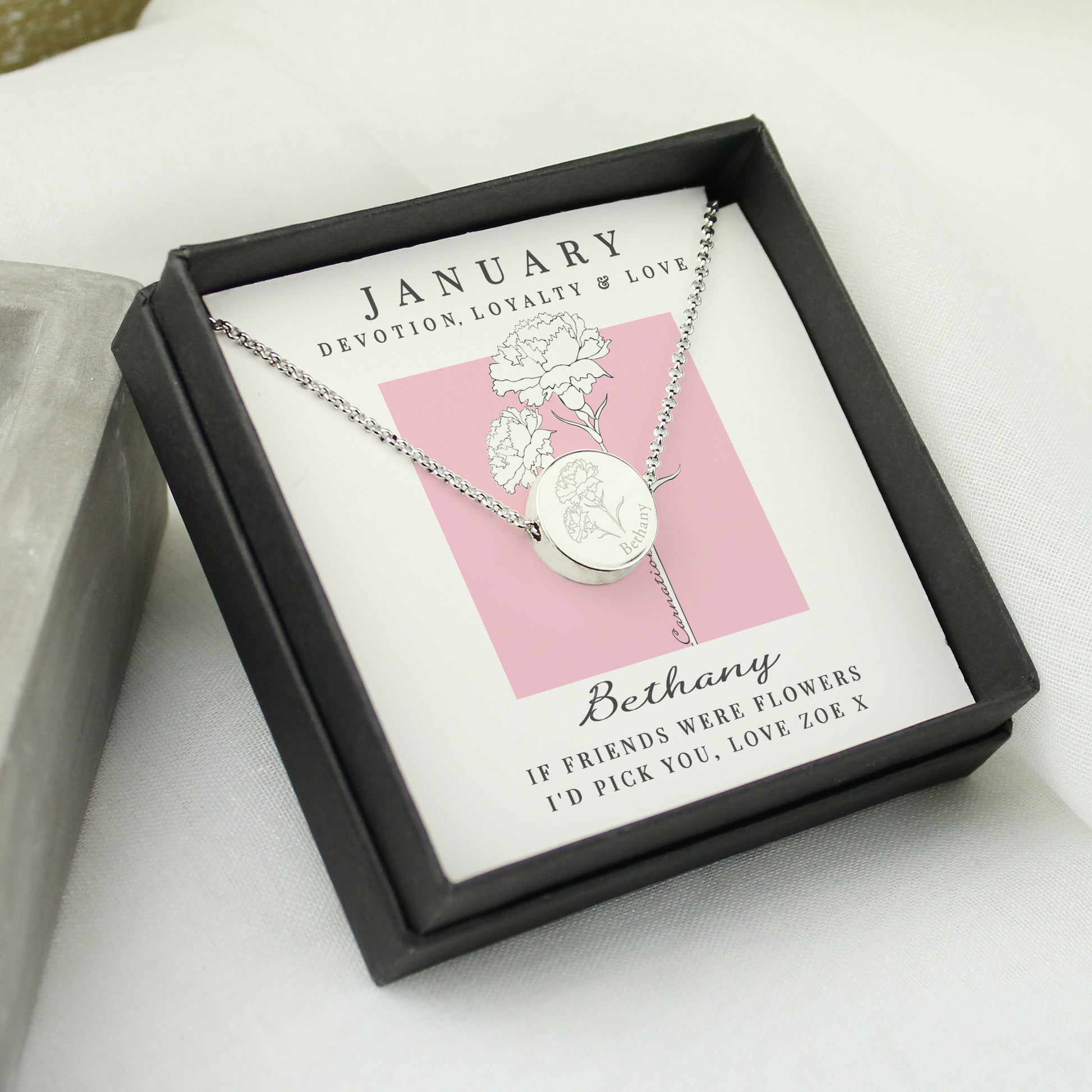 Featuring a colourful carnation illustration and the fixed text 'JANUARY - DEVOTION, LOYALTY & LOVE', you can make this gift extra special by adding a personal message as below
