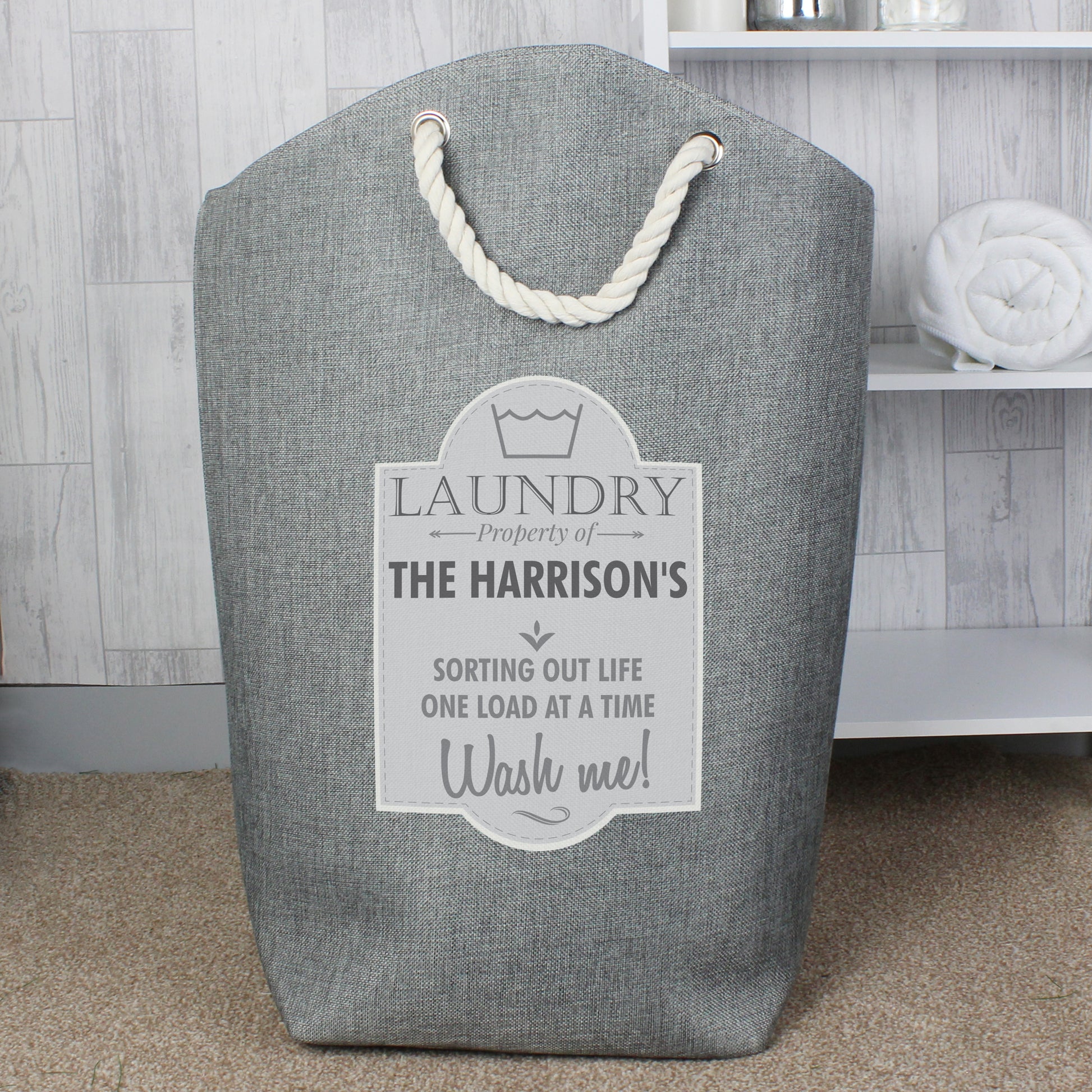 This stylish laundry bag features practical and stylish rope carry handles.
