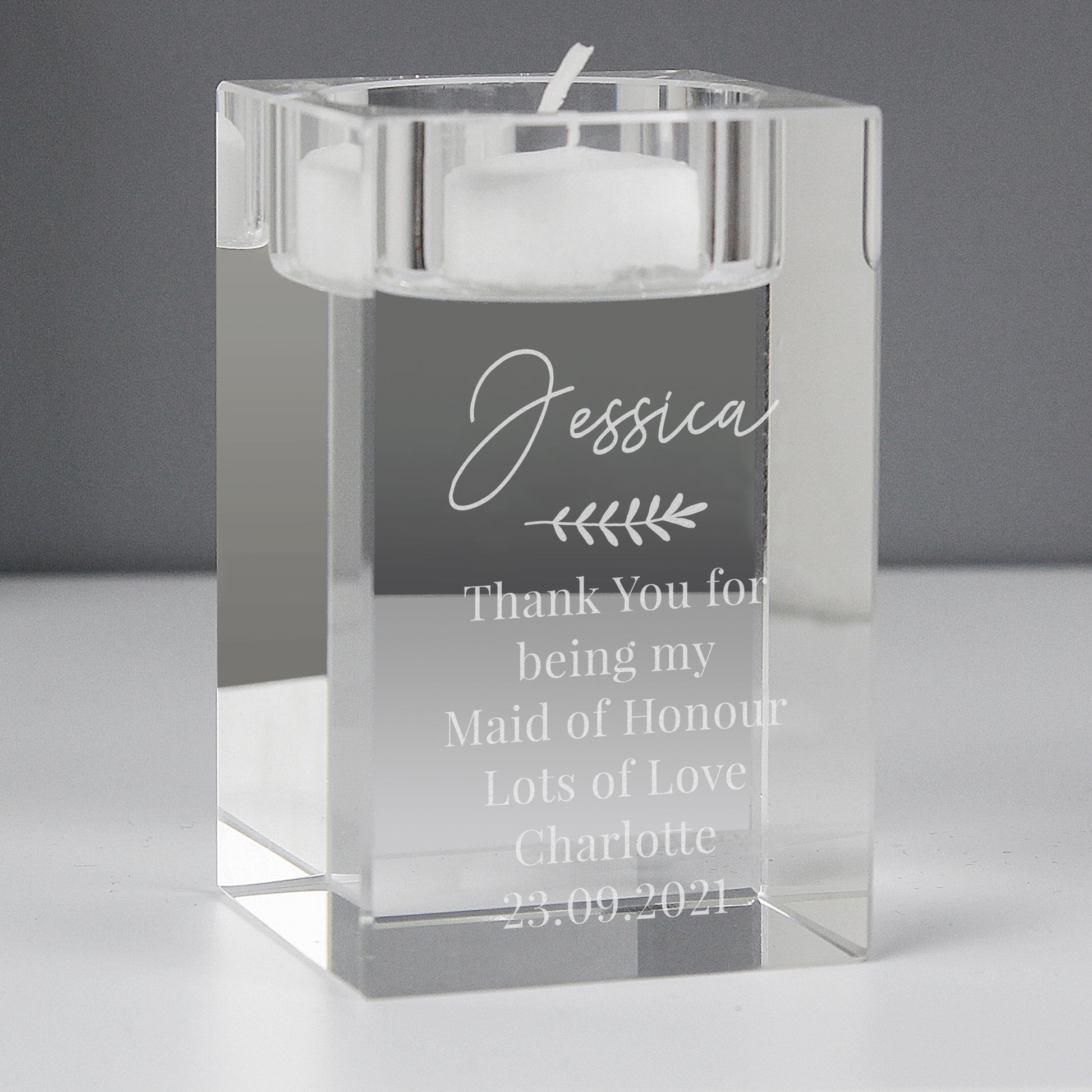 Personalise this Tea Light Holder with a name / role up to 12 characters long and a message of up to 6 lines with 20 characters available per line.
