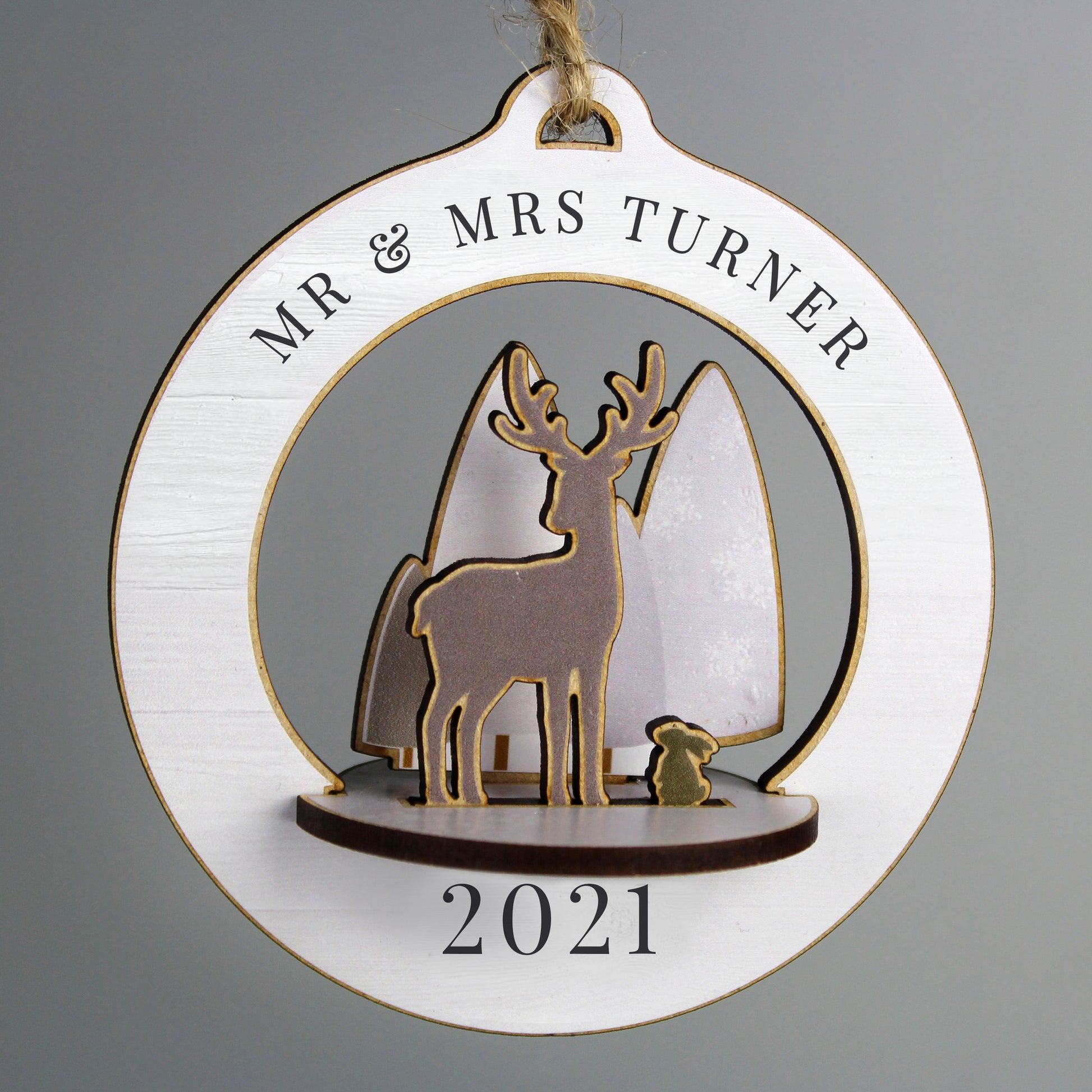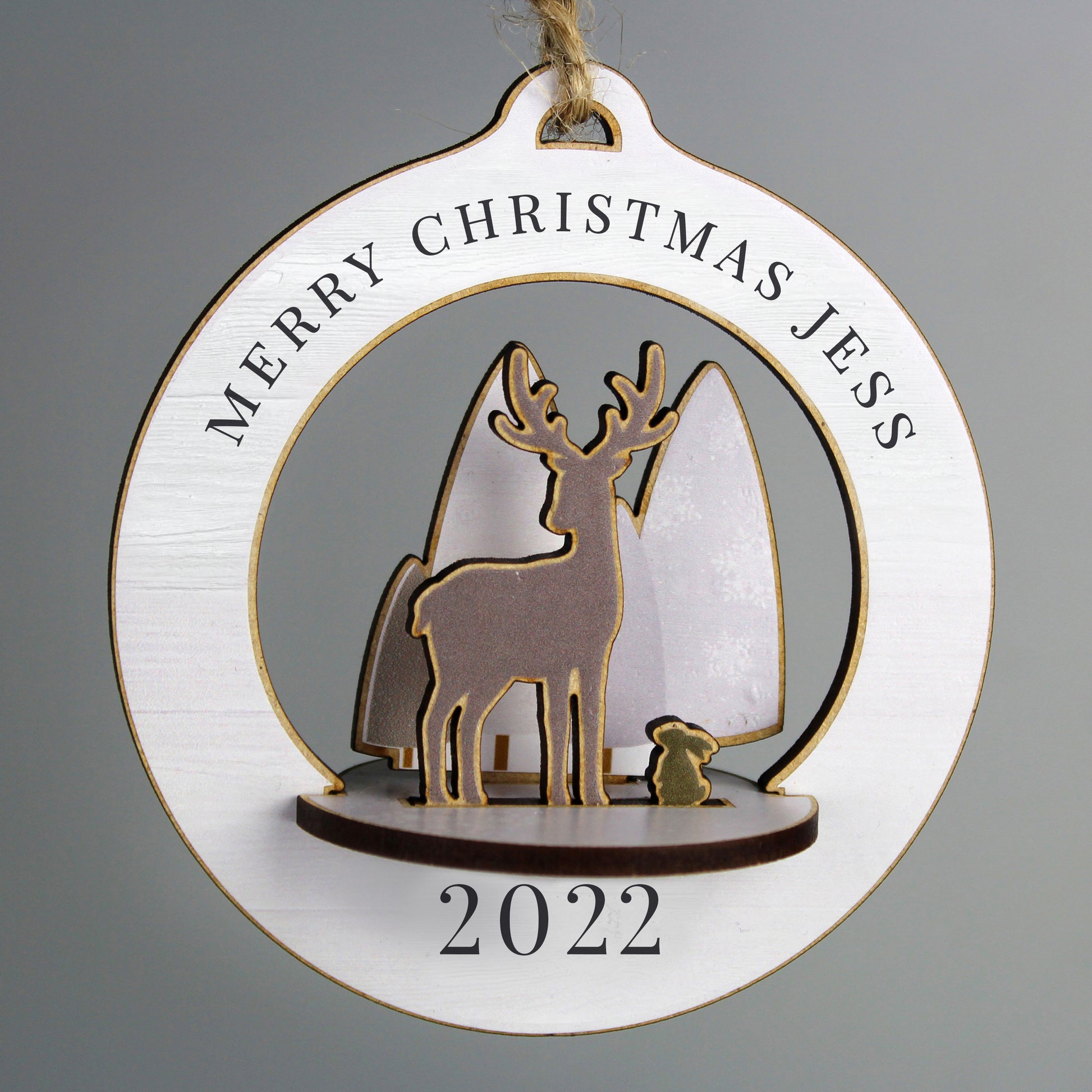 You can personalise this tree decoration with 1 line of 25 characters and 1 line of 4 characters.