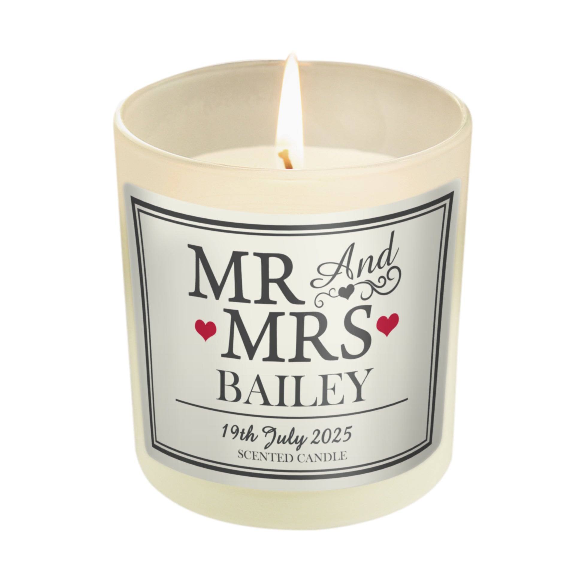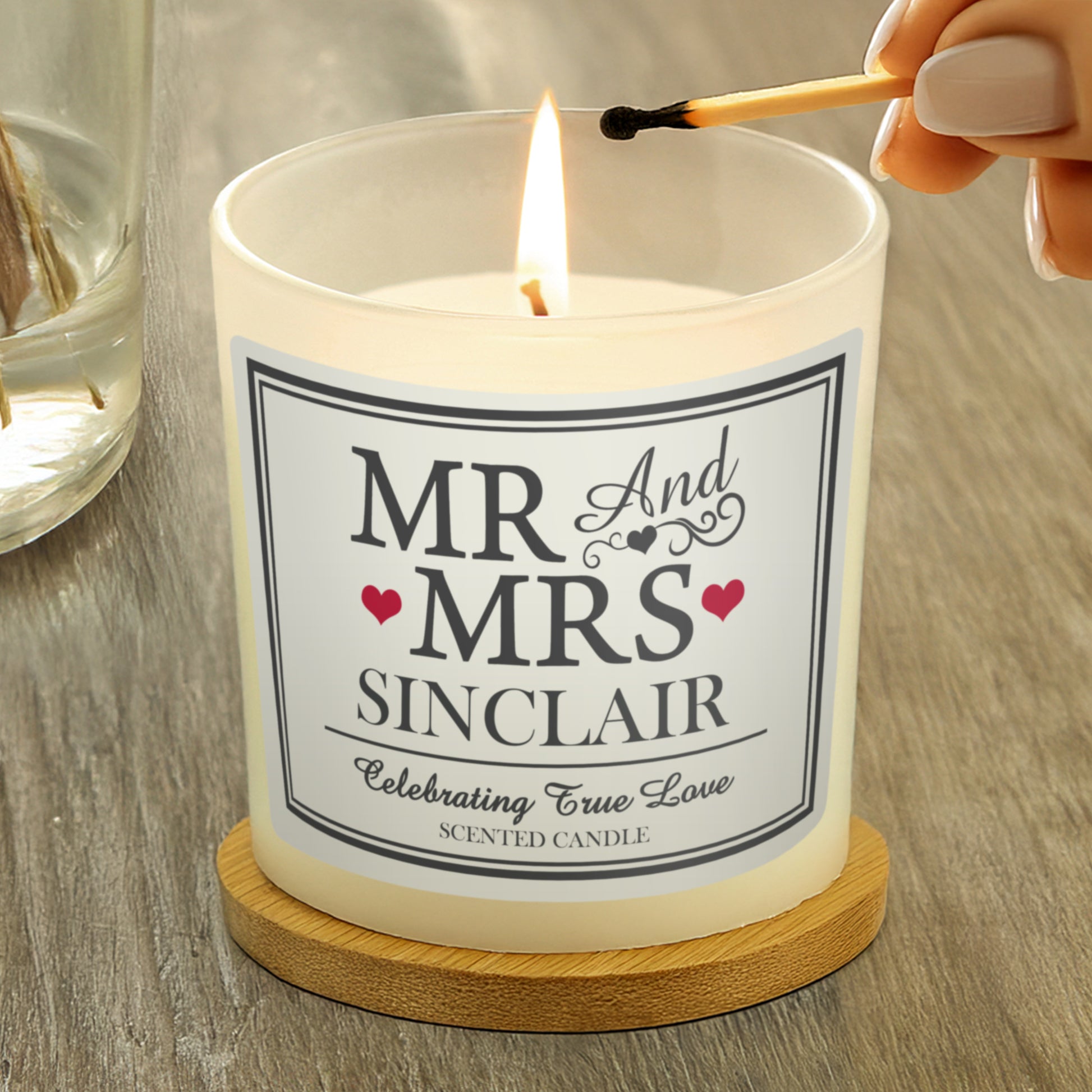 The words 'MR And MRS' are fixed. You can then personalise this candle in a jar with a surname up to 15 characters (which will appear in UPPERCASE) and a further line of text up to 25 characters in length (which is case sensitive and will appear as entered).