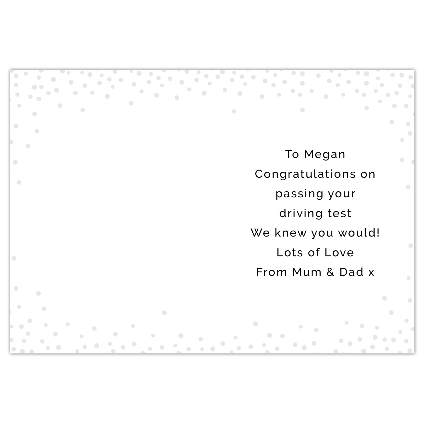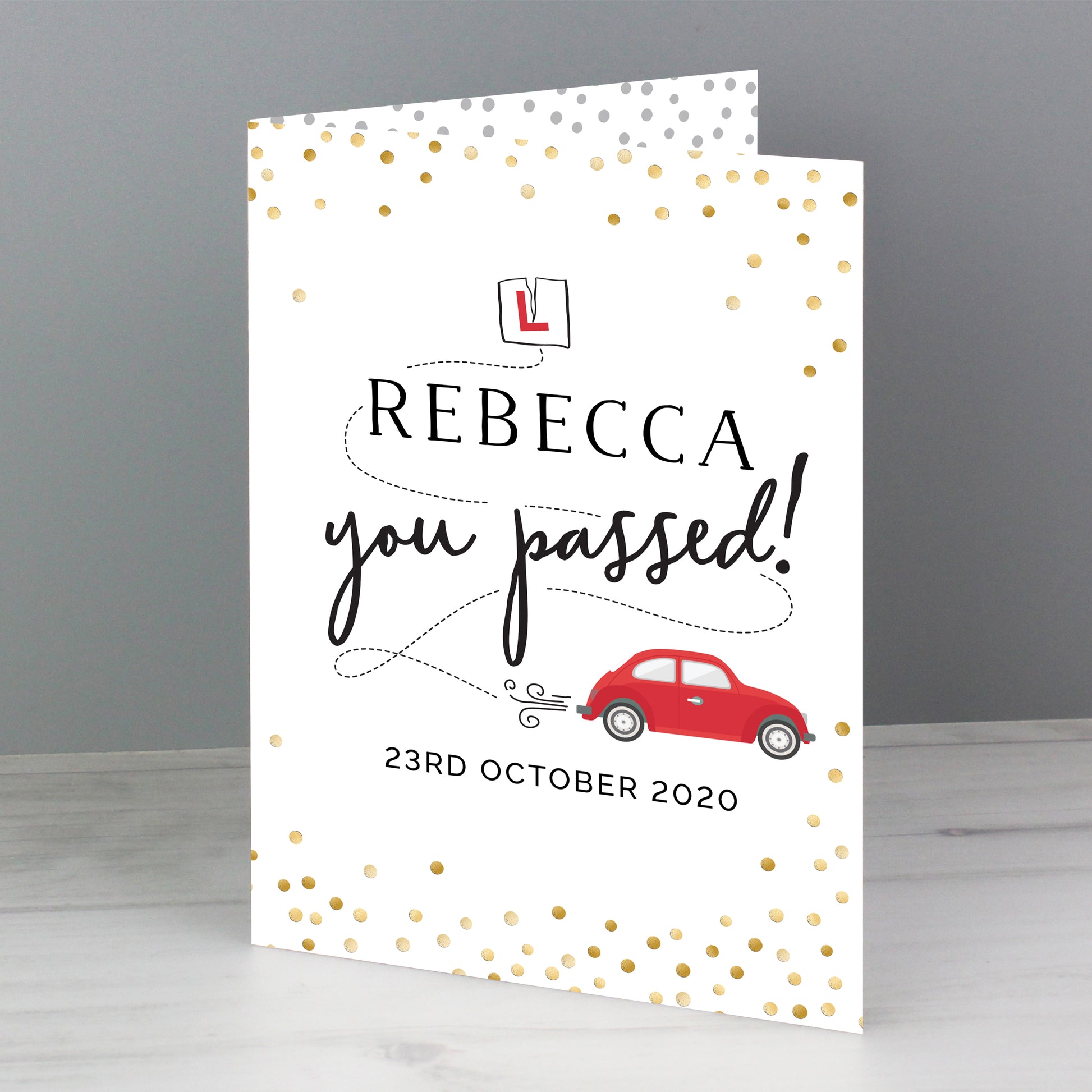 This bright modern design features a car zooming off on its first adventure and the wording 'you passed!'