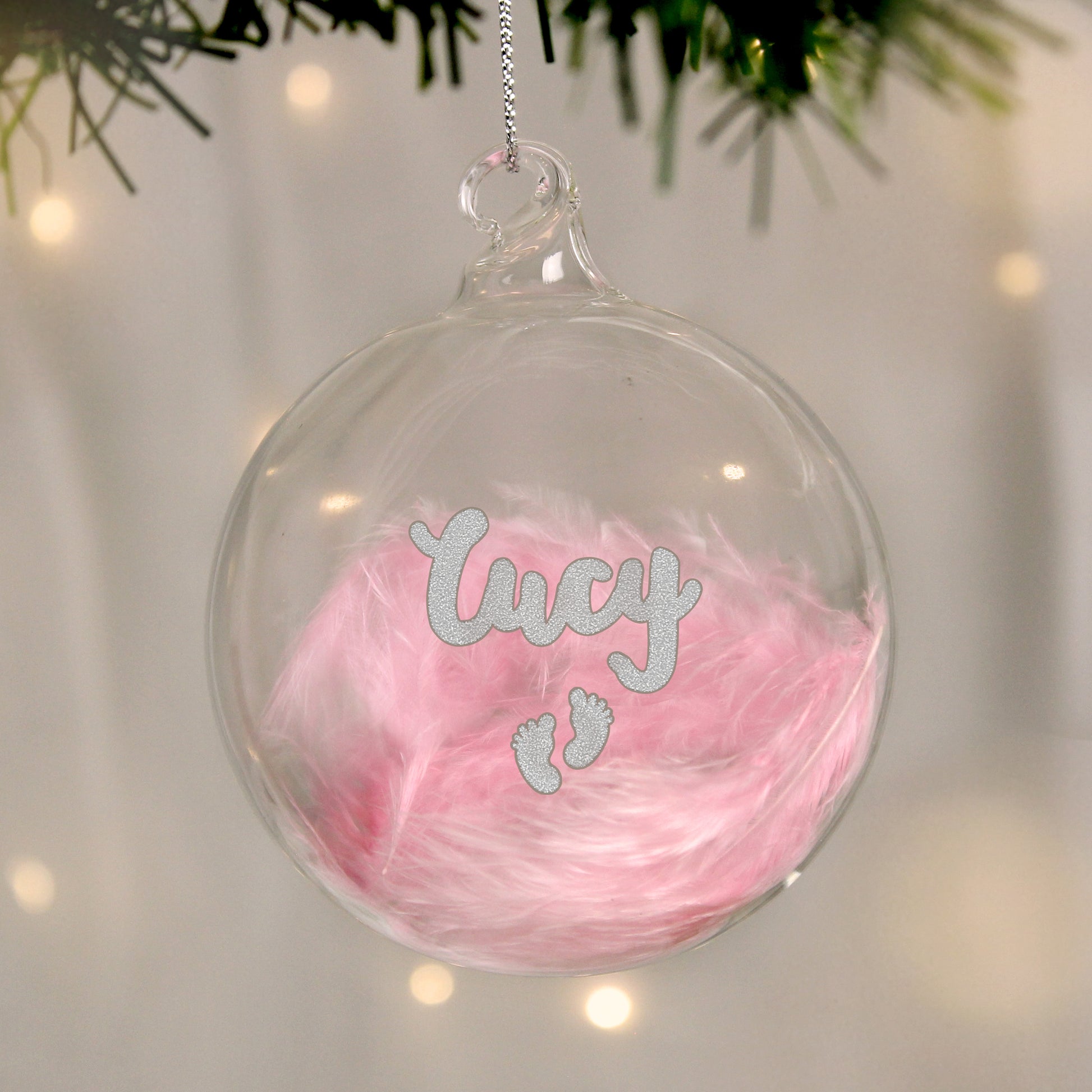 Personalised Pink Feather Silver Footprints Glass Bauble