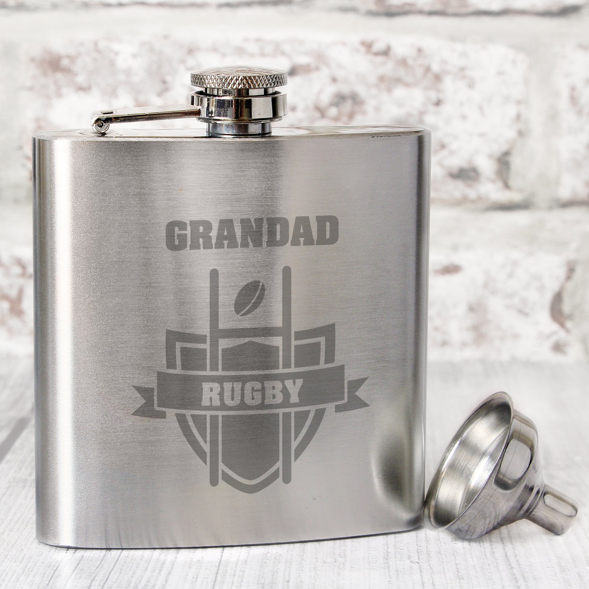 You can personalise this Hip Flask with a name up to 12 characters which will appear at the top. The word 'RUGBY' is fixed text.