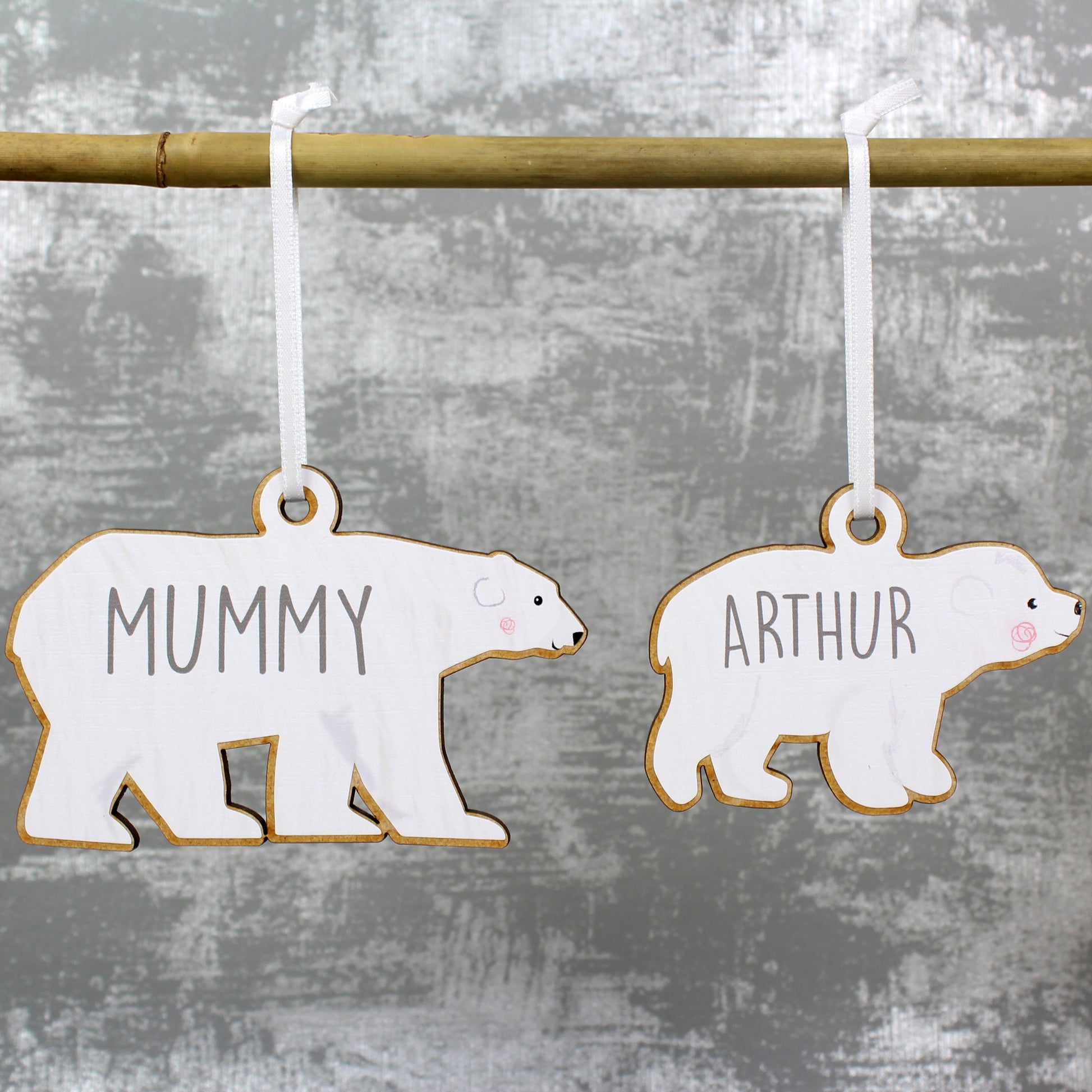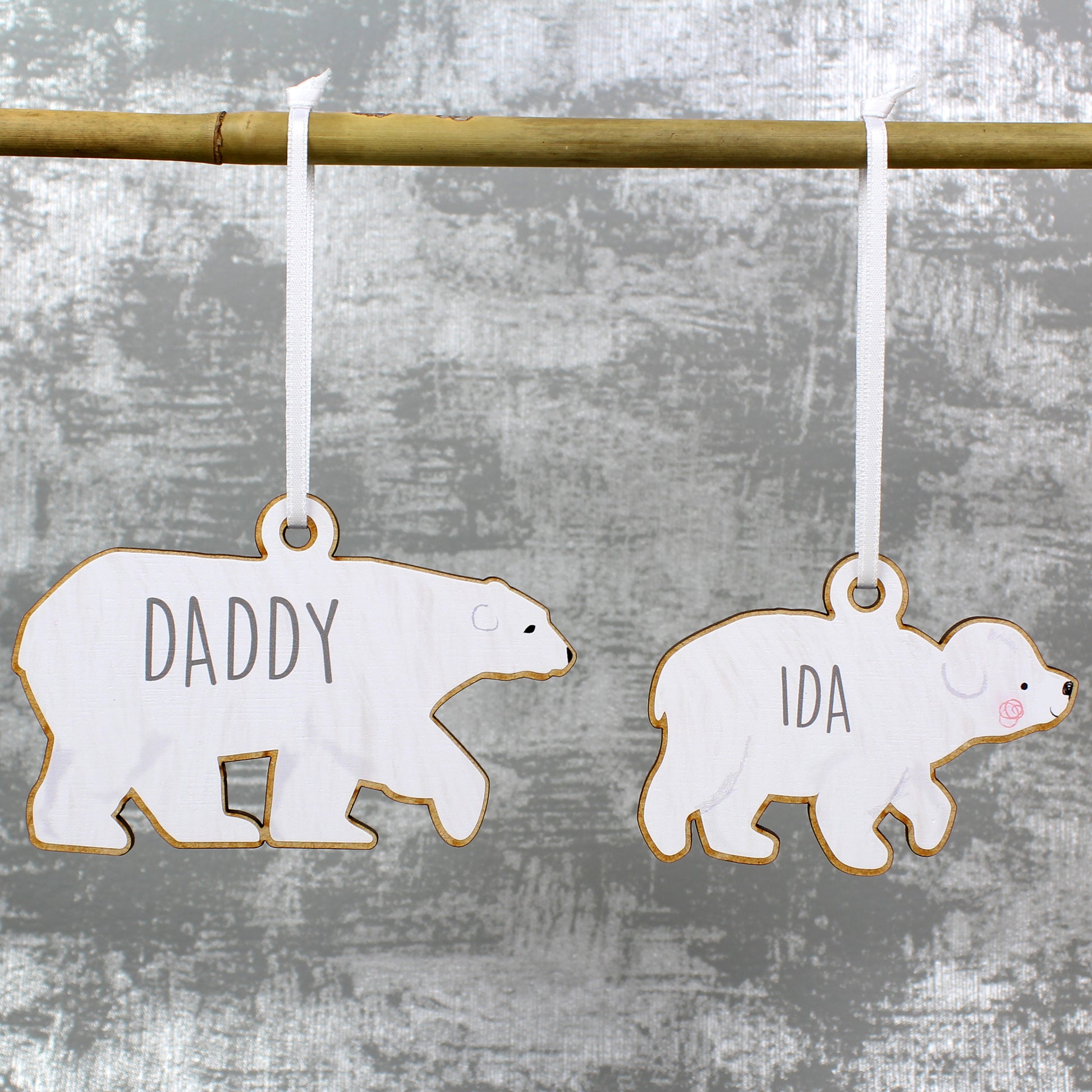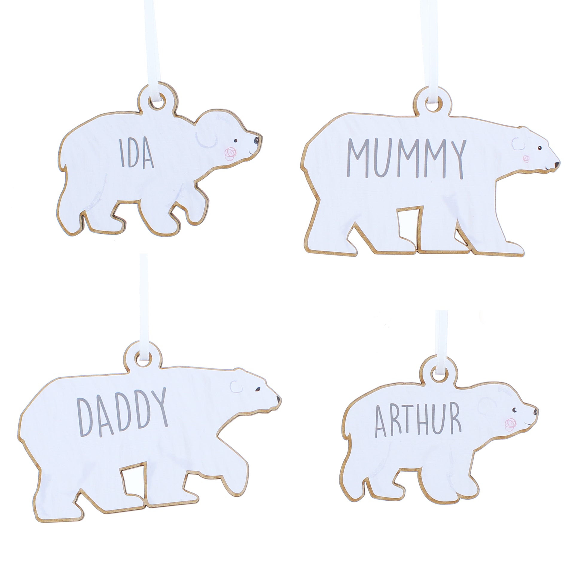 Personalised Set of Four Polar Bear Family Wooden Hanging Decorations