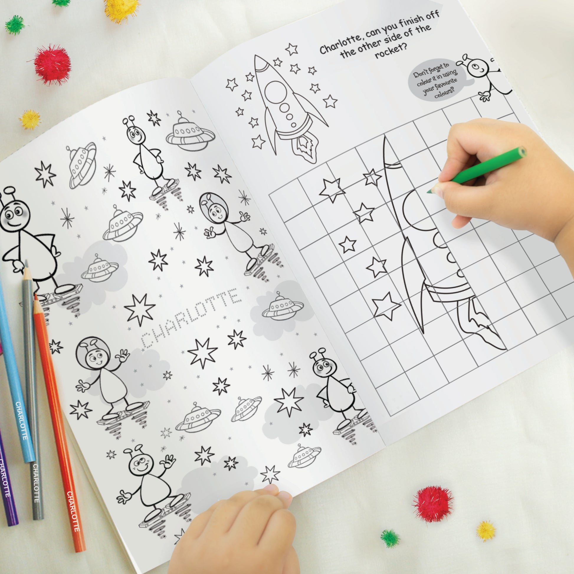 The set contains a Space Colouring Book and 12 colouring pencils in assorted colours.