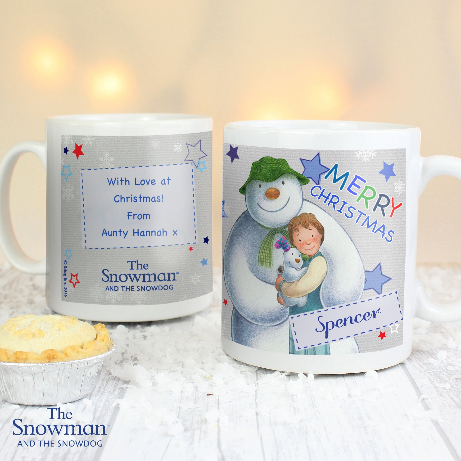 Our The Snowman and the Snowdog Blue Mug can be personalised with a name on the front up to 12 characters and a message on the back over 4 lines of text with up to 20 characters per line. The words 'Merry Christmas' are fixed text.