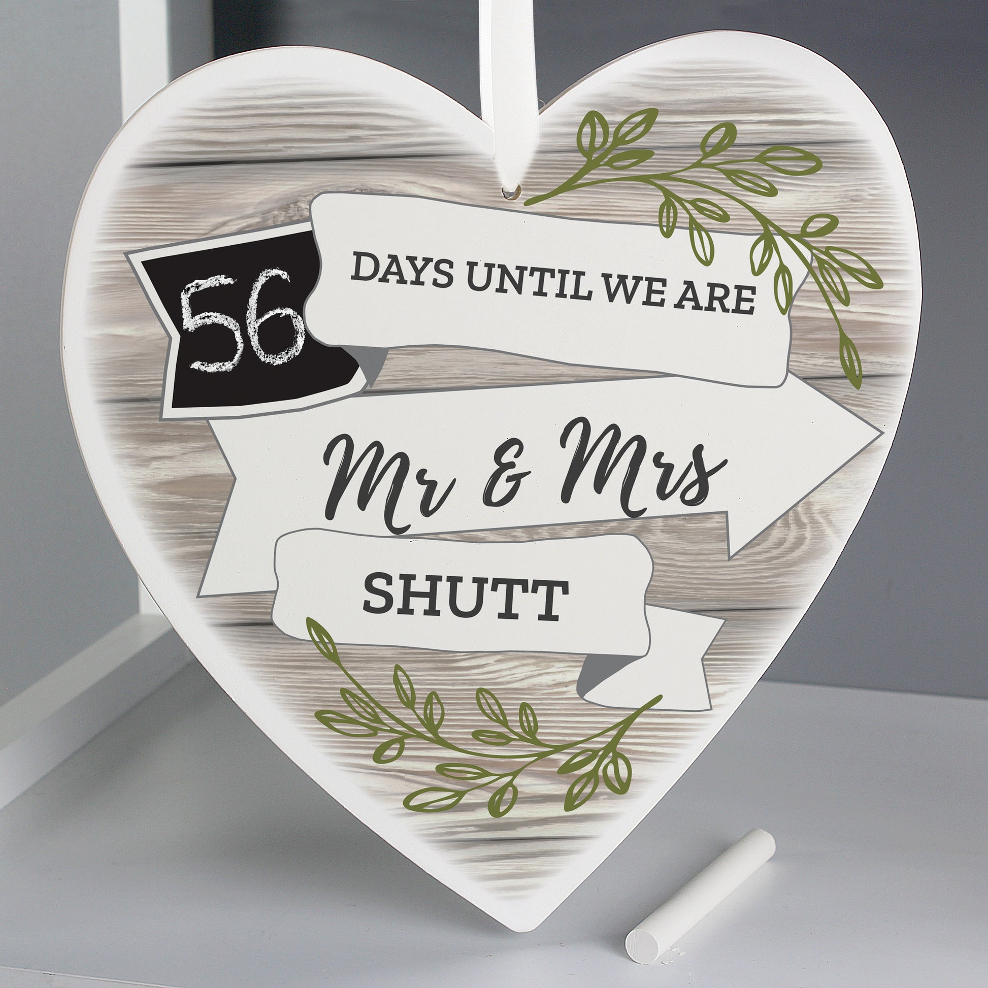 Personalised White Arrow Banner Chalk Countdown Wooden Heart Decoration